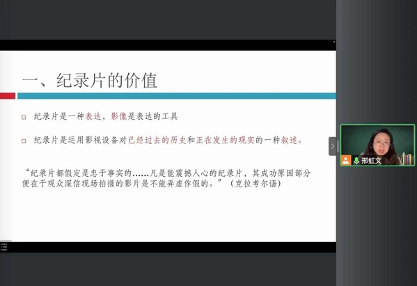 11月20日晚,上海国际中文教育工作联盟“语虹讲堂”第十四期在线开讲。本次讲堂由我校国际交流处承办,国际交流处副处长张正怡主持,上海纪录片学院副院长邢虹文主讲,近百位师生在线参与。