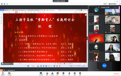 为共同探索资助育人长效机制,11月20日下午,由政府管理学院举办的上海市高校“资助育人”专题研讨会在线举行。此次研讨会邀请来自上海交通大学、上海大学、华东政法大学、华东理工大学、东华大学、上海海事大学、上海理工大学、上海健康医学院、上海电机学院以及上海工艺美术职业学院的十余位老师共同参与。我校学生工作部部长丁永建参会,会议由政府管理学院党总支副书记闯晓燕主持。