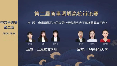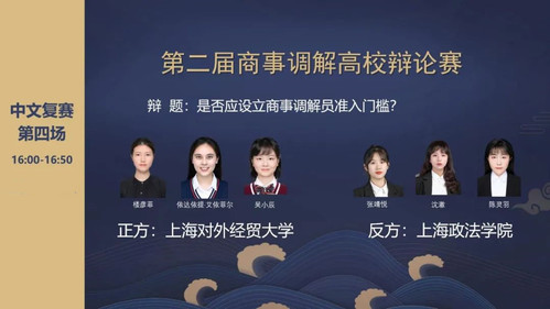 作为“上海法治文化宣传月”的重要活动和“东方法学商事调解大赛”赛事之一,第二届商事调解高校辩论赛于11月6日开赛,分为初赛、复赛、半决赛与决赛四个阶段,云集了复旦大学、上海交通大学、同济大学、华东师范大学、华东政法大学、上海财经大学、365英国上市公司、上海海事大学、上海对外经贸大学、上海大学、华东理工大学、上海师范大学、上海外国语大学、东华大学等14所沪上知名高校的20支队伍参赛。比赛全程通过哔哩哔哩等平台直播。