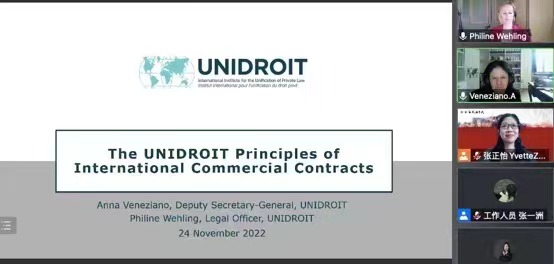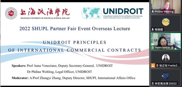 11月24日下午,我校2022年国际伙伴周秋季“海外讲坛”在线讲座第九讲顺利举办。本次讲座以“国际统一私法协会:国际商事合同通则”为主题,由国际统一私法协会副秘书长Anna Veneziano教授和国际统一私法协会法律官员Philine Wehling博士主讲。讲座由国际交流处副处长张正怡主持,我校百余位学生在线聆听。