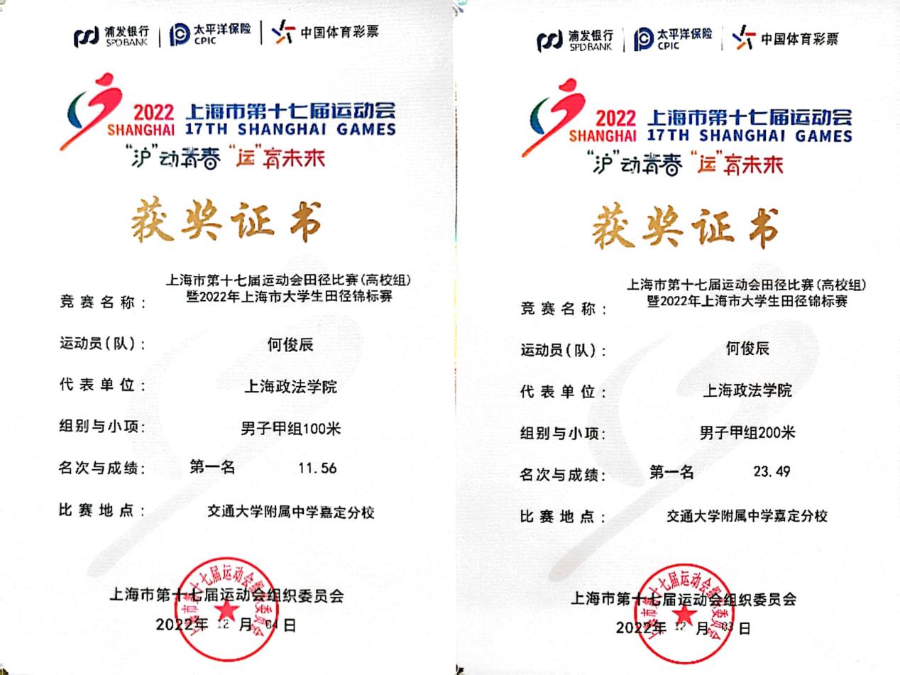 何俊辰同学作为学校选拔的优秀运动员,在体育部老师的专业指导下,刻苦训练、不懈努力,终于成为田径赛场上的“双冠王”。从打破学校记录到斩获上海市冠军,每一场比赛都是历练,每一次突破都是成长。我校学子在此次比赛中全力以赴、斩获佳绩,体现了上政学子的体育精神。学校将继续以组织学生参加各类体育赛事为契机,深入挖掘以“体”育人的精神资源,加强以“体”育人的项目建设。