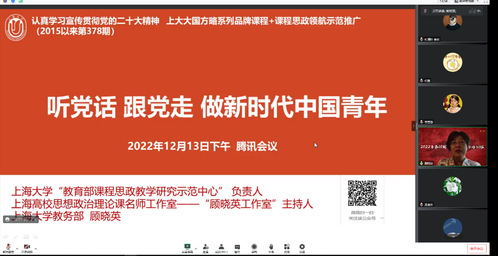 12月13日下午,上海大学顾晓英教授为政府管理学院师生作“听党话,跟党走——做新时代中国青年”专题讲座,学院师生党员、2022年第10期入党积极分子培训班学员参与聆听。学院党总支书记连淑芳教授主持讲座。