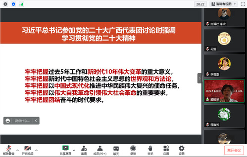 顾晓英教授以习近平总书记参加党的二十大广西代表团讨论时强调学习贯彻党的二十大精神与五个牢牢把握为引,指出从党的理论创新中彰显了历史自觉,要认真学习宣传党的二十大精神,既要整体把握、全面系统,又要突出重点、抓住关键。