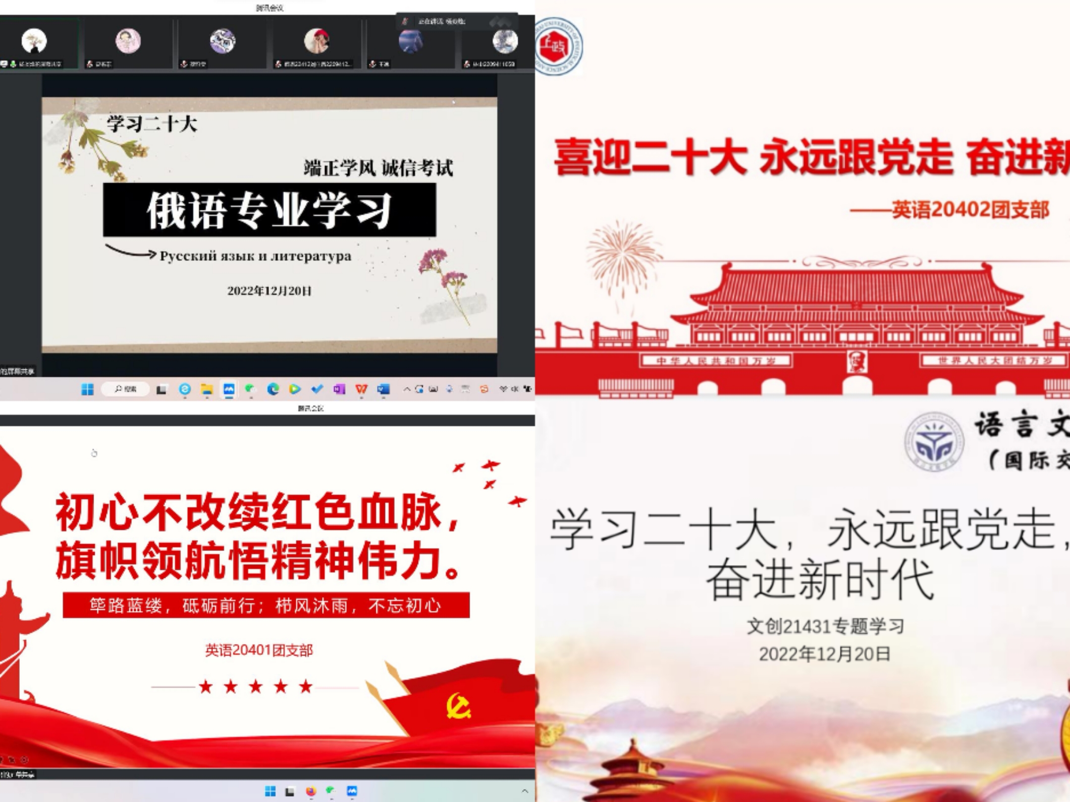 梦想从学习开始,事业靠本领成就。通过召开本次专题班会,语院学子“云端”交流学习,深受教育和启发,立志做有理想、敢担当、肯吃苦、能奋斗的新时代好青年,创造“强国圆梦、功成有我”的青春佳话。接下来,语言文化学院(国际交流学院)将立足时代、立足社会、立足学校、立足学院,持续推进学习贯彻党的二十大精神,为培养讲好中国故事、传播中国声音、弘扬中国精神的涉外人才不懈努力。(张宇洋 撰稿)