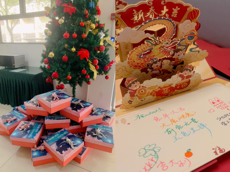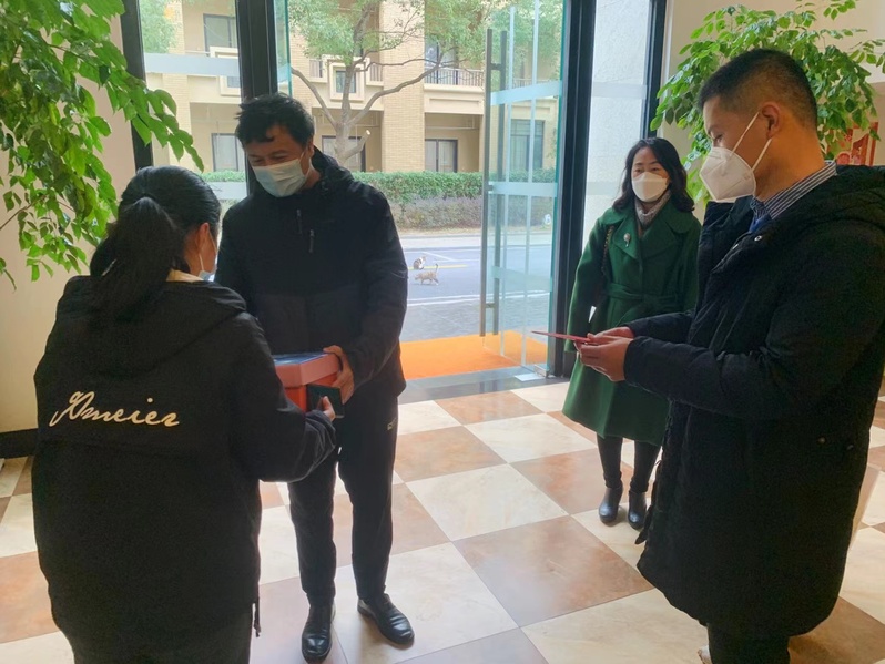 走访慰问中,刘刚为留校同学发放带有新年吉祥物“小兔子”的新年礼盒,丁永建为大家送上手写的中国特色新年贺卡,周怡介绍了假期校园服务和安全须知。师生亲切交谈学习和生活情况后,大家合影留念记录下这美好温情的时刻。