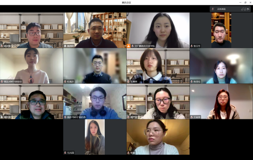 在英国利兹大学留学的王俞果、马元园、王瀚祺、陈滢佳、曹严喆,在俄罗斯莫斯科国立大学留学的韩廷伟、张立冬、张璇,在俄罗斯国立普希金俄语学院学习的杜胤达,以及在爱尔兰都柏林城市大学留学的胡亚欣等10名同学进行了线上交流,分享介绍了当地的风土人情、学校及专业和自己的学习情况、未来规划等。在交流互动环节,杨炎烽、卫广麒就同学们提出的问题作了详细解答。同学们对学院的慰问与关心表示感谢,表示将继续努力学习,不断提升眼界见识,充分展示中国留学生的良好精神风貌。
