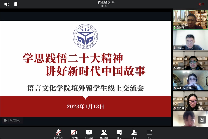 为加强对学院海外留学生的关心与培养,引导学生深入学习二十大精神,1月13日晚,语言文化学院召开“学思践悟二十大精神,讲好新时代中国故事”主题线上交流会。学院党总支书记魏传成、学工负责人魏洲阳以及辅导员杨炎烽、卫广麒参加。
