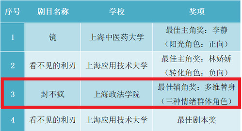 近日,由上海市教委立项支持、上海学生心理健康教育发展中心指导,华东理工大学承办的2022年“心故事 心成长”上海高校心理情景剧大赛圆满收官。大赛通过线上视频评审方式进行,共评选出一等奖2项、二等奖3项、三等奖5项,最佳主角奖、最佳辅角奖、最佳剧本奖等单项奖3项。我校推荐的纪录片学院作品《封不疯》(参演学生王睿、张文琪等,指导教师邢文馨等)从16所高校参赛作品中脱颖而出,获得2022年上海高校心理情景剧大赛一等奖和最佳辅角奖。