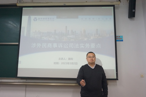 3月2日,上海盈科律师事务所股权高级合伙人、管委会委员、盈科全国海事海商专业委员会主任姜昀律师走进国际法学院《涉外民事诉讼律师实务》研究生课堂,带来一堂别开生面的涉外民商事诉讼司法实务要点讲座,也标志着国际法学院2023年涉外律师进课堂活动的正式启动。