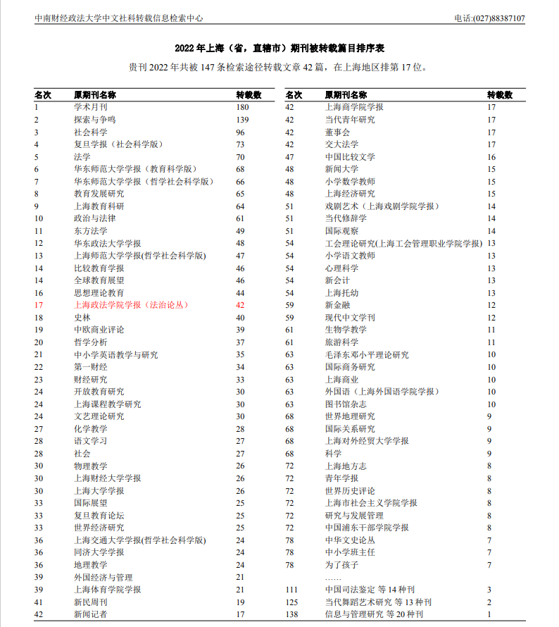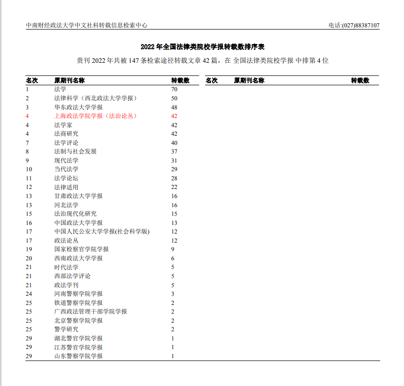 近日,据中南财经政法大学图书馆期刊信息检索中心《检索报告》统计显示,《365英国上市公司学报》(法治论丛)2022年刊文被《新华文摘》《中国社会科学文摘》《高等学校文科学术文摘》《社会科学文摘》和《人大复印报刊资料》等权威二次文献147条检索途径转载文章42 篇次(2021年31篇次),再创历史新高。在全国法律类院校学报转载数中排第4位(2021年排名第7位),在上海地区排第17位(2021年排名第25位)。