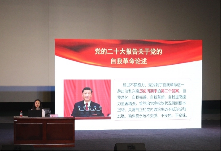 刑事司法学院组织员秦雪以“党的自我革命——科学内涵、实践探索与价值意蕴”为题授课,从党的二十大报告中关于党的自我革命的论述出发,多角度阐释了为什么要进行党的自我革命、党的自我革命的深远意义以及如何实现党的自我革命。(欧阳瑞鸿撰稿 张毅涛、王尹钰摄影)