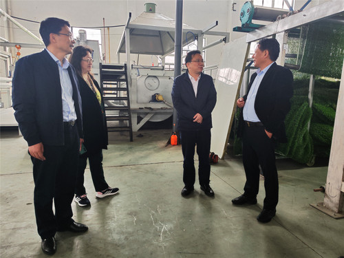 夏小和一行来到公司生产车间,实地了解天路集团此次捐赠给学校的公司王牌产品——地坪行业全球领先的编织型混合草系统,详细了解该系统的制作工艺、行业标准与环保理念。在听取了公司生产负责人的介绍后,夏小和表示公司发展理念超前、制作工艺先进、社会责任厚重。当前,全体上政人正根据党的二十大所绘就的宏伟发展蓝图,紧紧围绕学校“十四五”发展目标奋勇迈进。天路集团对上政教育事业的无私支持,对于我们进一步坚定信心、勇毅前进提供了新的强大精神动力。他强调,学校相关职能部门要根据上级部门具体要求,落实落细足球场捐赠项目各项细节工作,努力做到师生受益、校友满意。
