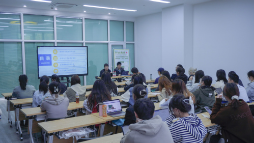 裘欣璐介绍了“职”此青绿职业生涯工作室的工作目标和工作理念,阐述了工作室前期积累、孵化过程,预告了近期推出的系列活动。她表示,“职”此青绿职业生涯工作室旨在建设一个立足于学院特色,集学院教学、校友、事业发展资源于一体的大学职业生涯规划室,希望同学们的职业生涯从此“一路绿灯”,通往光明的未来。