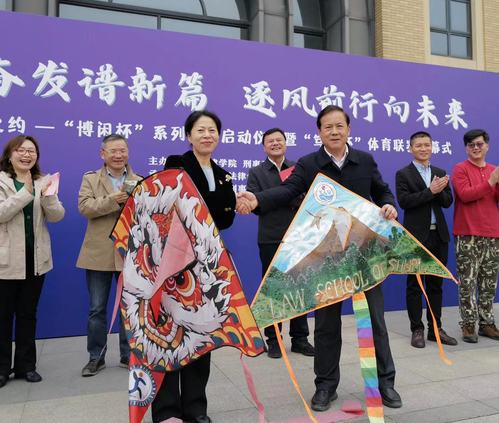 启动仪式上,法律学院党总支书记文立月、刑事司法学院党总支书记姚善英代表学院互赠了风筝。法律学院赠予的风筝名为“醒狮”,既是“刑司”之谐音,又是象征刑司学院具有如雄狮一样不屈不挠的力量。刑事司法学院赠予的风筝名为“清律”,象征法律学院如蜻蜓一样能随风飞翔,飞越山峰,一往无前。互赠风筝环节是春日放纸鸢的传统文化体现,也是对两院通力合作“筝筝”日上的美好祝愿。刑事司法学院党总支副书记张丽艳介绍了活动背景,法律学院学生会主席徐佳乐代表两院学生对办好本次活动表达了决心。