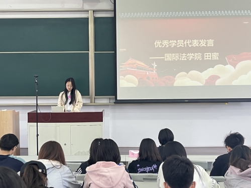 国际法21141田蜜作为优秀学员代表发言,表示通过本次培训班的学习,进一步端正了入党动机,掌握了党的理论知识,今后将进一步把培训班的学习成果转化为具体实践。
