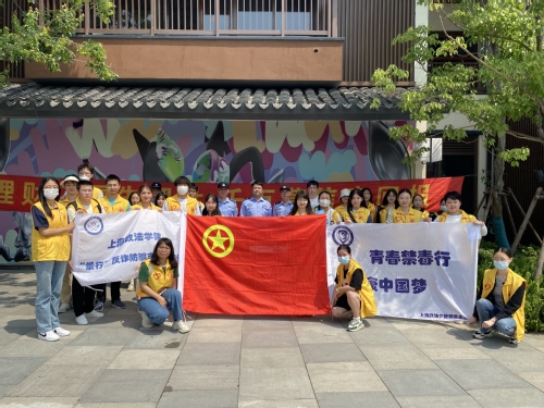 为深入开展主题教育,紧紧锚定“学思想、强党性、重实践、建新功”的总要求,引导青年在实践中汲取养分、增长才干,营造全民反诈禁毒的浓厚氛围,在刑事司法学院团委书记盛思涵的带领下,禁毒志愿者协会和“景行”反诈防骗工作室青年志愿者联合上海市公安局青浦分局徐泾派出所的民警同志,于5月14日在青浦区蟠龙新天地、海天花园和虹悦华庭小区开展禁毒反诈宣传活动。