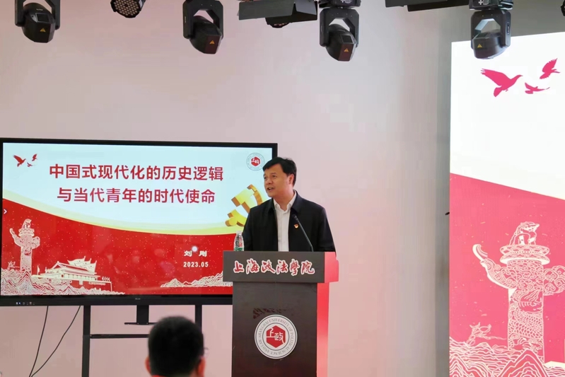 5月12日下午,校党委副书记刘刚在成德楼多功能厅讲授“中国式现代化的历史逻辑与当代青年的时代使命”专题党课。部分入党积极分子、“腾飞计划”学员班学生、党史党情课班级学生和上政附中学生参加党课学习。