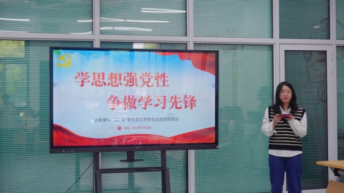 为增强学生党员担当作为的使命责任,在学思践悟中坚定理想信念,5月19日,上政第5学生党支部、上政第10学生党支部、上政第18学生党支部联合开展“学思想强党性,争做学习先锋”主题党日活动。活动由上政第18学生党支部谢珍主持,上政第18学生党支部书记裘欣璐与全体支部党员参与。