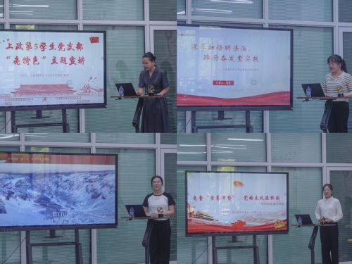 “亮特色”环节,各支部逐一展示支部特色。上政第5学生党支部从“样板党支部”创建、事迹简介、工作规划三个方面,展示了良好的学生党员形象和支部整体形象。上政第10学生党支部从组织建设、思想、实践、服务四部分出发,讲述支部内“特色、融合、有效”的党建工作品牌引领发展机制。上政第18学生党支部展示了“理·响”故事会的成果,由支部的杨慧同志和何璐同志,围绕“乡村振兴”,分别以“长白山的二十年”和“免费的营养早餐”为主题,向大家讲述了自己家乡如何实现教育脱贫。
