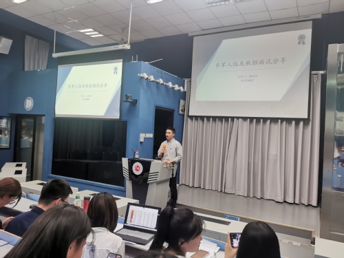 预备党员顾宏吉从部队生活及职业发展路径、简历制作及面试技巧和实习经历三个板块进行分享,用热血入伍的报国情怀和征兵政策,向同学们发起应征入伍的号召;用亲身经历讲述面试经验,传授面试技巧、展示简历制作要点,鼓励同学们敢于尝试、大胆应聘。