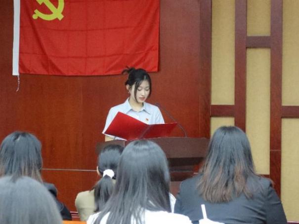 毕业生党员代表上政第29学生党支部朱茜回顾了自己的大学四年和入党经历,衷心感谢学校和老师的谆谆教导,会带着母校的祝福与期盼展翅高飞,让青春在党和人民最需要的地方绽放。