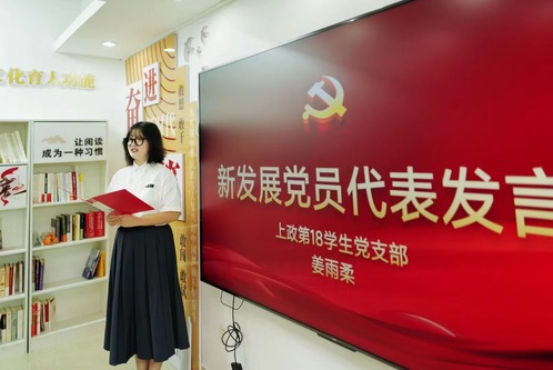 上政第18学生党支部姜雨柔作为新发展党员代表进行发言,感谢党组织的教育培养,并代表新一批预备党员向党组织承诺:坚定理想信念,对党忠贞不渝;践行根本宗旨,保持公仆意识;秉持严实作风,夯实成事根基。时刻牢记习近平总书记的殷殷嘱托,以许党报国之志疏浚源头活水,以挺膺担当之姿谱写奋斗华章,始终坚持与祖国同行、为人民奉献,奋力走好新的赶考之路,让青春在党的照耀下熠熠生辉。
