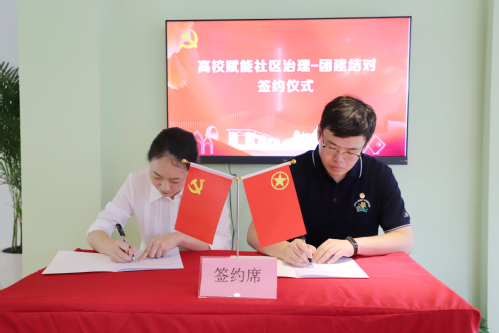 在高校赋能社区治理-团建结对签约仪式上,佘山镇团委书记杨蕾、刑事司法学院团委书记盛思涵签署协议,表示将结合双方发展目标,坚持院地共建、资源共享,实现共同进步。
