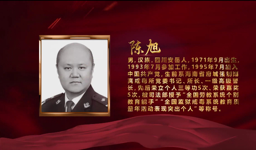 陈旭同志是我校90级劳改法专业学生,1990年-1993年在我校求学。陈旭同志生前系海南省府城强制隔离戒毒所党委书记、所长、一级高级警长。2022年5月22日,陈旭在海南省司法厅警衔晋升培训班授课时突发脑溢血,经抢救无效不幸离世,年仅50岁。2022年10月1日,海南省委追授陈旭同志“海南省优秀共产党员”称号,海南省委、省政府为其追记个人一等功。2023年3月30日,人力资源和社会保障部、司法部追授其为“全国司法行政系统一级英雄模范”称号。