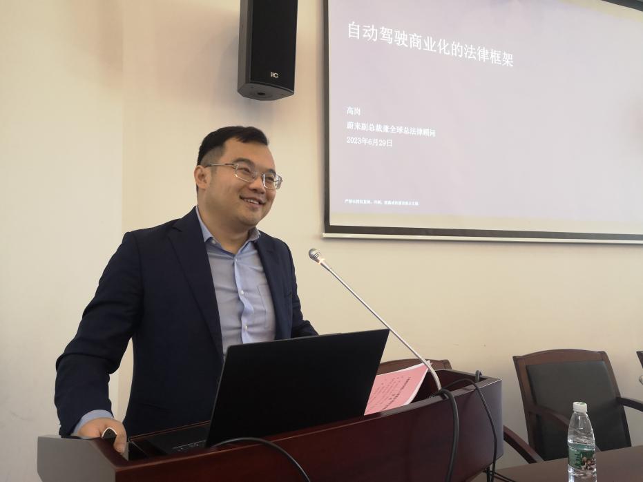 仪式第二部分为“人工智能法治前沿”系列讲座。高岗以“自动驾驶商业化的法律框架”为题,详细介绍了蔚来公司的发展概况和自动驾驶商业化背后的法律问题,包括蔚来智能系统的组成内容(车载智能硬件、整车计算平台等),与人工智能技术发展的关系,自动驾驶交通事故责任分配与保险机制等问题。