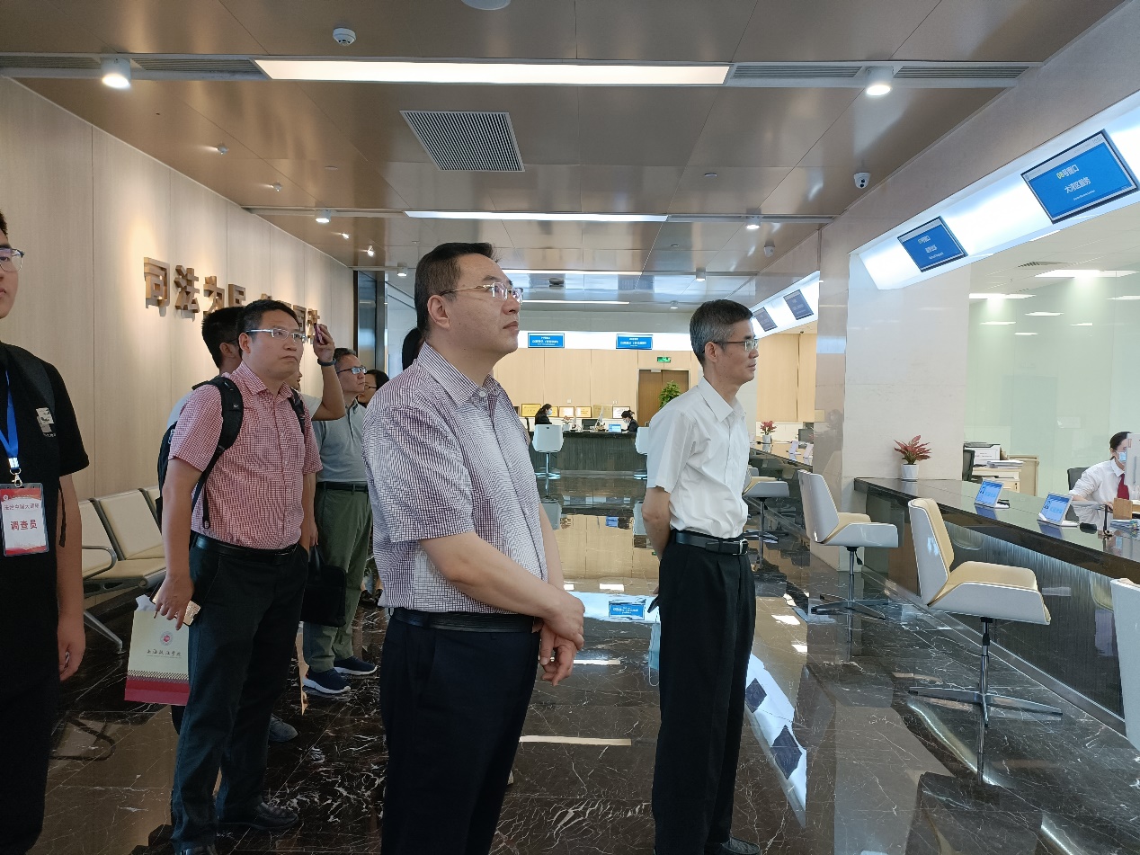 调研组随后来到立案大厅,参观前海法院的特色立案窗口,了解受理案件类型,线上见证窗口工作流程和特点以及创新设置法官联络窗口,通过网络技术实现网上立案、送达,借助“区块链+人工智能+云计算”,研发“金融云审”“知产云审”系统,实现一键诉讼等。从前海法院的各服务窗口功能设置中,调研组充分感受到前海法院“司法为民,公正司法”的服务理念。