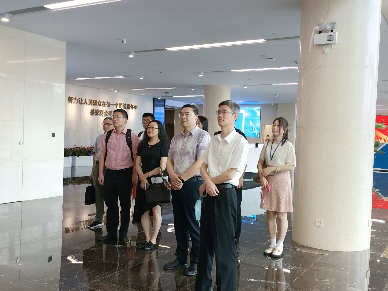 7月18日,调研组一行前往横琴粤澳深度合作区人民法院开展实地调研,法院副院长曹如波、一级法官聂斌华、综合办公室主任王铭扬陪同调研。调研组首先参观了横琴新区发展规划展馆,对横琴粤澳深度合作区人民法院的工作背景有了初步了解。通过参观,调研组更深入了解粤港澳大湾区和横琴粤澳深度合作区的国家战略,更直观地认识到横琴新区法院所在地区的战略性地位,以及粤澳共商共建共治共享新体制、政策体系和重点产业等。