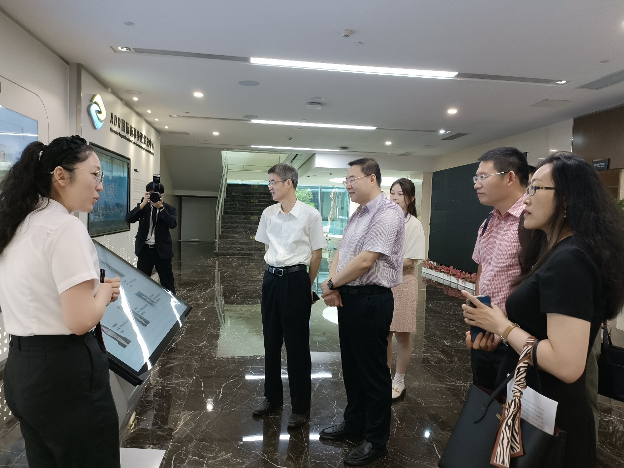 7月19日,调研组一行前往深圳前海合作区人民法院开展实地调研。在前海法院党组成员、副院长慈云西的陪同下,调研组首先观看前海法院宣传片,参观了法智管家系统,了解前海法院的基本情况和案件办理信息。通过实时更新的数据大屏,调研组直观感受到前海法院年度收结案数量逐年增加,年度收结案比始终保持在较高水平,展现出前海法院法官高水平、高效率的办案素质。其中,香港地区案件数已超一万件,适用域外法案件累积达179件(适用香港法超一百次),体现了前海法院不断提升前海法律事务对外开放水平和建设具有竞争力的审判体系的努力。