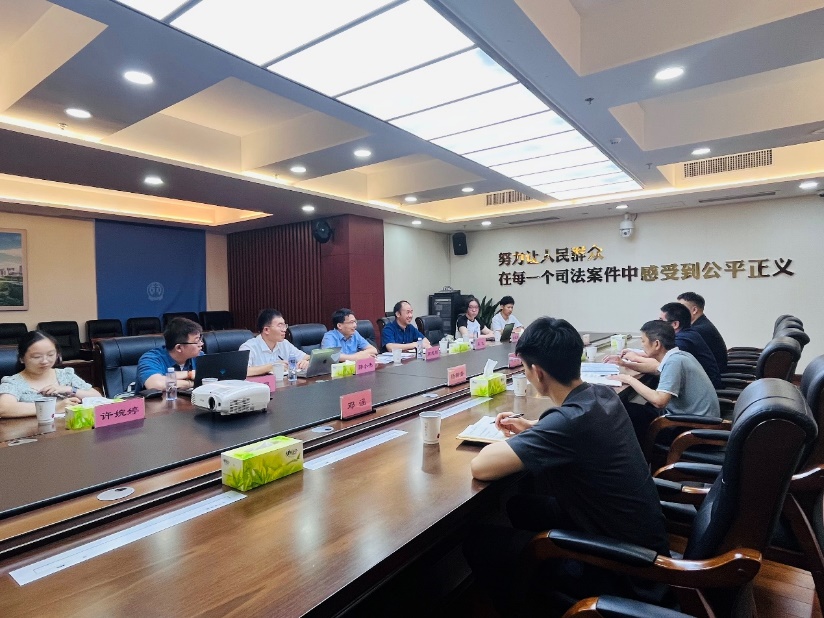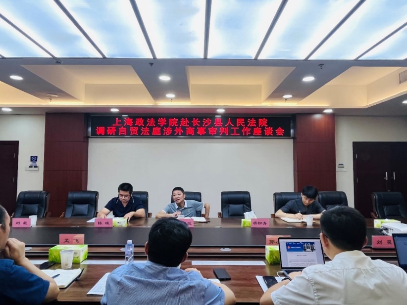 长沙县人民法院自贸片区人民法庭于2022年5月12日正式挂牌成立。7月11日,调研组赴长沙县人民法院调研,长沙县法院党员成员、副院长何正良、自贸片区法庭庭长杨柳青、副庭长陈斌、法官助理刘毅和邓涵参加座谈。双方围绕自贸片区法庭成立一周年的主要做法和运作经验、具有地方特色的自贸区法庭的制度创新、涉外商事案件的类型和特征等进行了广泛交流。长沙县法院自贸片区法庭发布了专门的周年报告,法官助理邓涵详细介绍了报告撰写过程和体会。调研组旁听了一起商事审判案件,并参观了立案大厅、诉讼服务中心、电视剧《底线》拍摄场景等地。调研组在法院的支持下,对社会公众进行了问卷调查,指导受访者填写问卷,保障了问卷回收的质量。