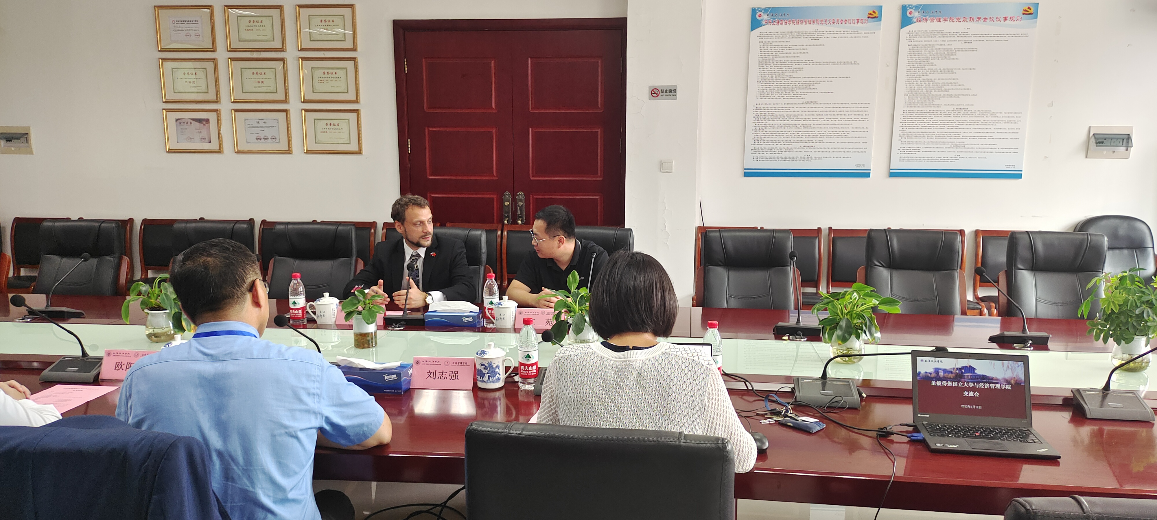 会前,刘志强先行陪同与会嘉宾参观了经管学院,并对经管学院育人理念、专业布局和师生情况进行了介绍。会上,刘志强首先表示希望在师生交流、学术科研合作以及产学研方面与圣彼得堡国立大学展开深度合作。在学生交流方面,基于电子商务及法律本科、法经济学硕士可进行3-12个月学术交流项目。在学术合作方面,围绕俄罗斯近年来在商业法规上的动态变化,希望能在上合基地的平台上产生更多学术交流成果。在产学研方面,将会同海华永泰律师事务所等实务部门一起参加如圣彼得堡论坛等高规格国际法律论坛。