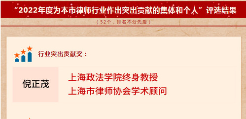 9月17日,上海市第十二届律师代表大会第一次会议成功召开。大会对获评“第五届东方大律师”“2019-2022年度上海市优秀律师”“2019-2022年度上海市十佳律师事务所”“2019-2022年度上海市优秀律师事务所”“2022年度为本市律师行业作出突出贡献的集体和个人”“2022年度上海律师业好新闻”等的集体与个人颁授证书。我校教授、上海市律师协会学术顾问倪正茂荣获行业突出贡献奖。