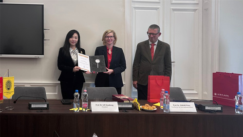 访问结束后,赛格德大学向刘晓红校长赠送了国际交流合作纪念证书,表达对我校长期合作友谊的高度重视,以及对未来深化合作的真诚期待。双方互赠纪念品并合影留念。
