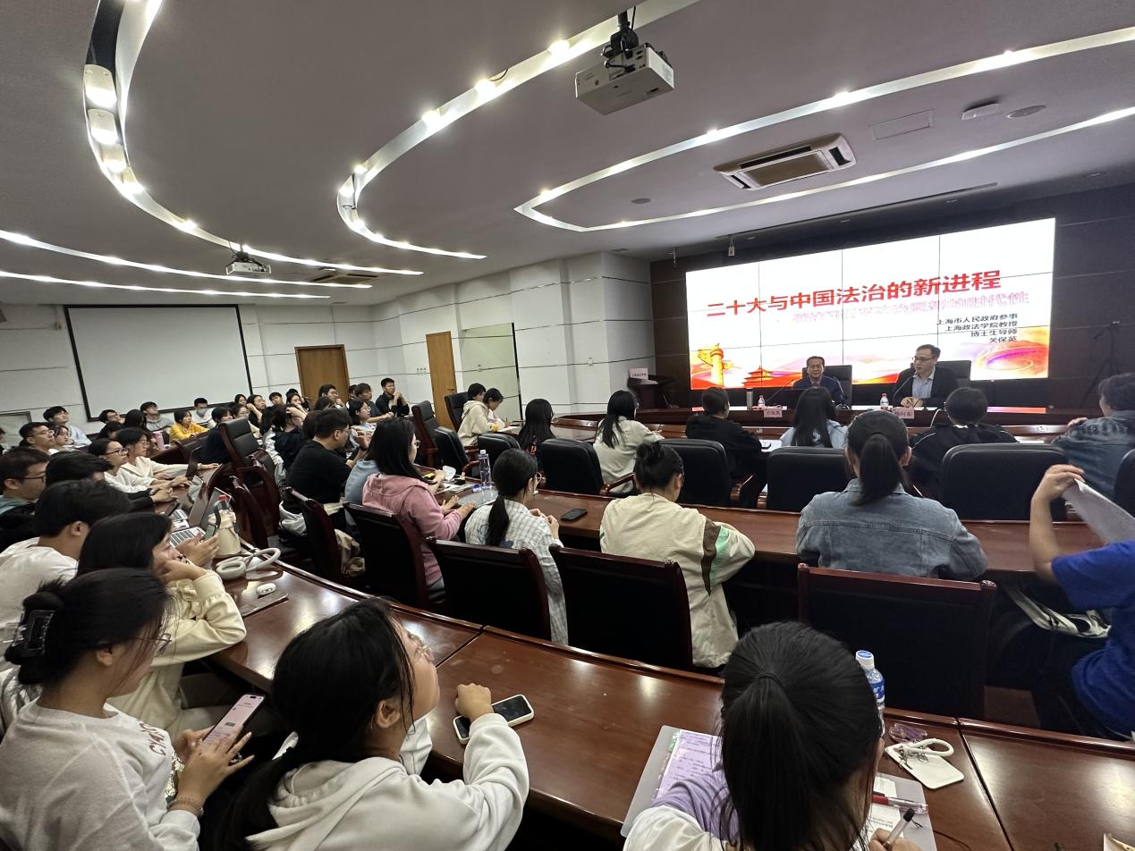 10月18日晚,新生系列讲座法学第三讲在求实楼513会议室开讲,上海市人民政府参事、学校原副校长关保英教授为2023级新生作题为“二十大与中国法治的新进程”讲座,近百名师生现场聆听。讲座由法律学院副院长杨向东副教授主持。