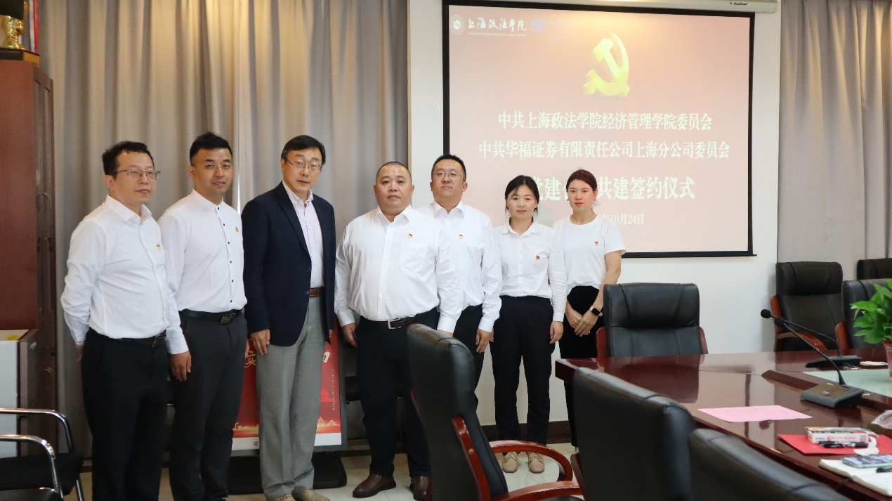 为进一步深入学习贯彻习近平新时代中国特色社会主义思想,用高质量党建引领事业新发展,推动校企合作跃上新台阶,10月24日下午,经济管理学院与华福证券上海分公司举行党建共建签约仪式。经济管理学院党委书记周毅,党委副书记、院长刘志强,党委副书记丁明强,华福证券上海分公司党委书记庄跃光,党委委员、纪委书记陈文杰,纪委委员、第二党支部书记夏伟杰及双方党员代表共同出席此次签约仪式。签约仪式由丁明强主持。
