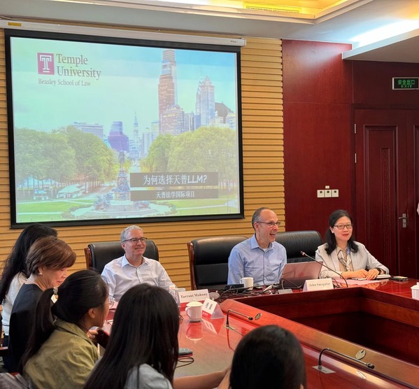 10月30日,美国天普大学法学院副院长桑国亚(John Smagular)、法学院中国项目主任麦泰伦(Tarrant Mahony)及法学院中国项目运营主任杨晨一行来访我校。国际交流处副处长张正怡会见了天普大学代表团,经济法学院党总支副书记叶卉、副院长曹阳、副教授杨彤丹等参加会见。