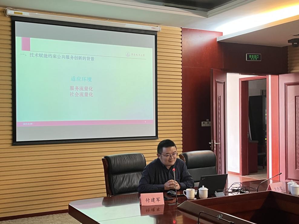 11月1日上午,图书馆(档案馆)在汇知楼101会议室召开2023年兼职档案员培训会,邀请华东政法大学政府管理学院付建军副教授为全校专兼职档案员作“技术赋能与档案公共服务创新”专题讲座。讲座由图书馆副馆长、档案馆馆长方乐莺主持,学校各部门兼职档案员参加。