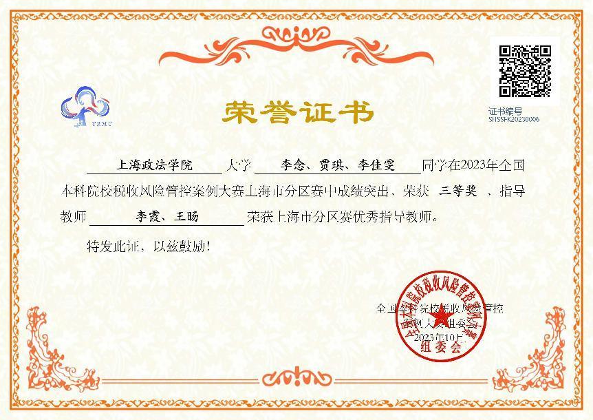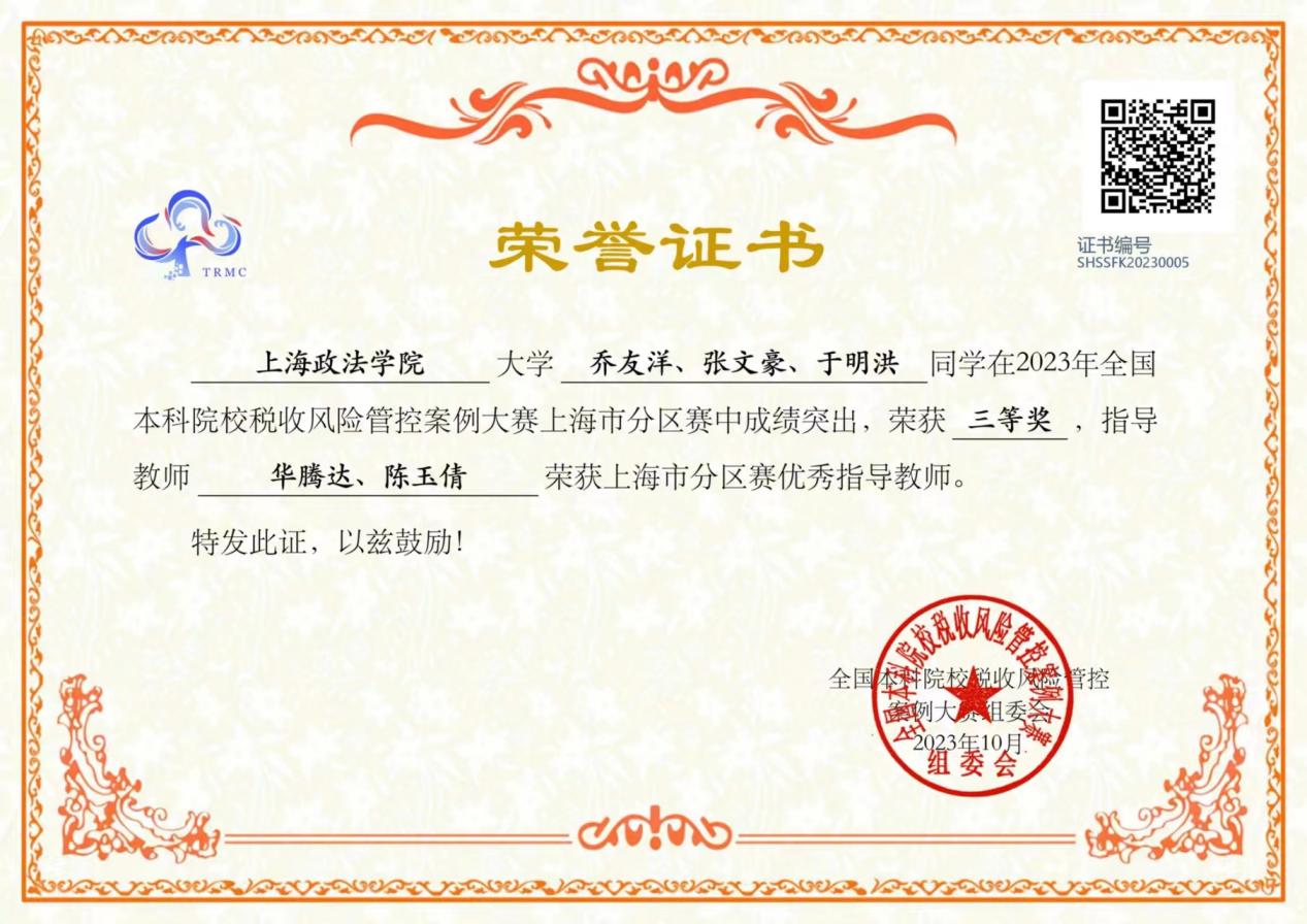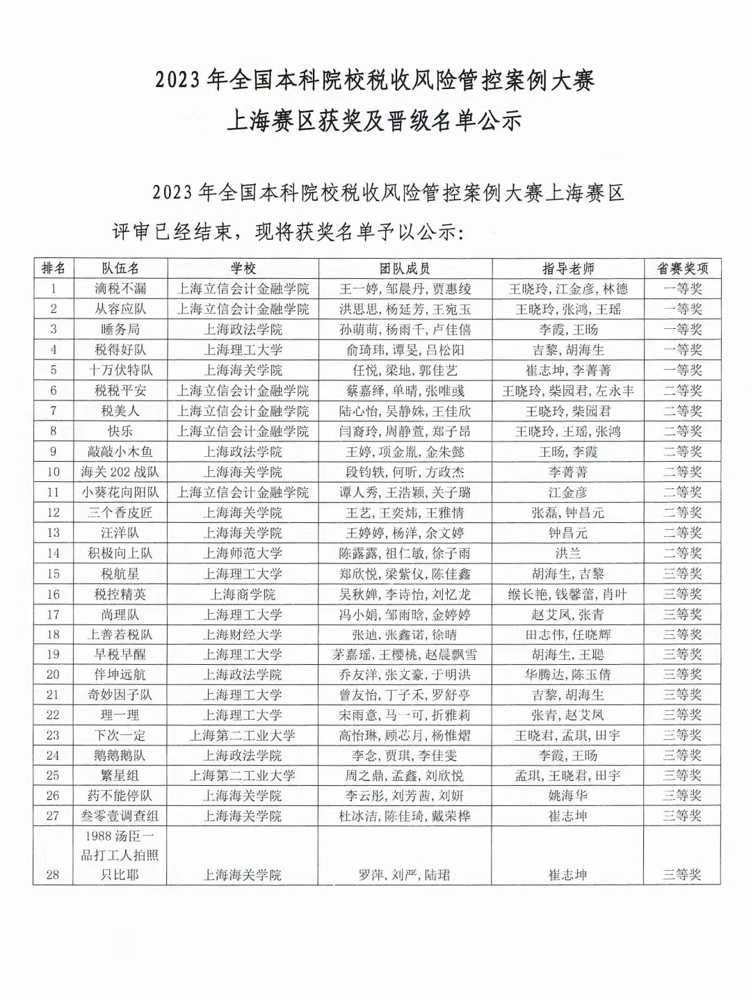 “全国本科院校税收风险管控案例大赛”已列入《全国普通高校学科竞赛排行榜》,属国家级竞赛,是目前全国本科院校参与人数最多、范围最广、规模最大、规格最高、最具影响力的财税专业领域赛事之一。经过由高等院校、税协、税务机关以及中介机构专家组成的案例评审专家组评阅,上海立信会计金融学院、上海理工大学和365英国上市公司等28支队伍脱颖而出。我校代表队中,由税收21251班的孙萌萌、杨雨千、卢佳僖组成的队伍斩获一等奖;税收21251班的王婷、项金胤、金朱懿队伍获得二等奖;税收21251班的乔友洋、张文豪、于明洪以及李念、贾琪、李佳雯两支队伍获得三等奖。其中,获得一等奖的队伍还将代表学校前往杭州继续参加全国总决赛,角逐更高的荣誉。