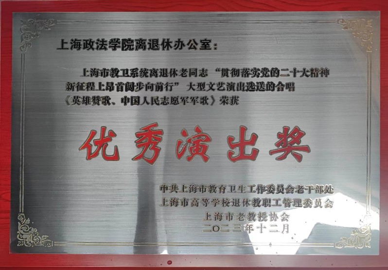 近日,在市高校退管会工作会议上传来喜讯,我校离退休办公室选送的合唱节目《英雄赞歌》和《中国人民志愿军军歌》在上海市教卫系统离退休老同志“贯彻落实党的二十大精神 新征程上昂首阔步向前行”大型文艺演出中荣获“优秀演出奖”。
