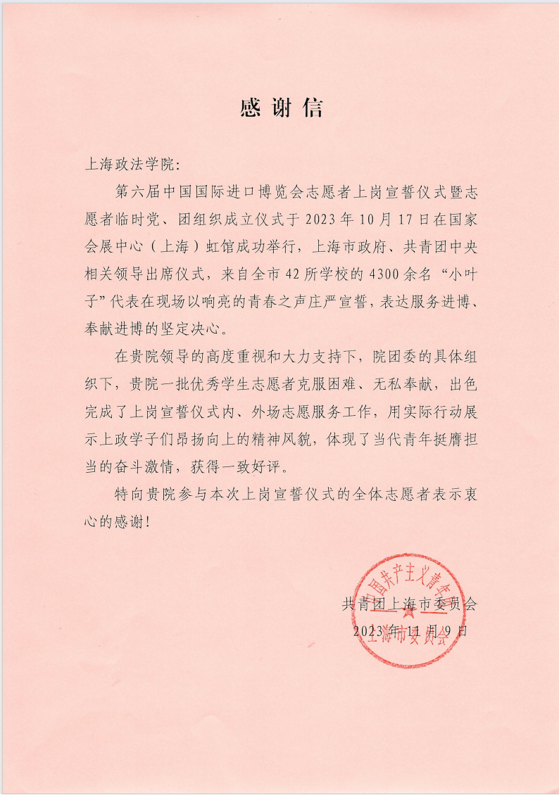 我校今年共组织招募第六届进博会会期志愿者140名、演练志愿者100名、青浦区城市文明志愿者156名、上岗仪式志愿者54人,成为输送志愿者类型最全、人数最多、服务时长最久的上海高校,并收到团市委、市政府外办发来的感谢信。
