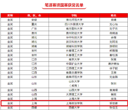 近日,备受瞩目的2023“外研社•国才杯”“理解当代中国”全国大学生外语能力大赛英语组系列赛项获奖名单出炉,我校国际法学院法律硕士(国际仲裁)专业邹世豪同学(指导老师:范湘萍)荣获笔译赛项国赛金奖,语言文化学院(国际交流学院)陈雅璐(指导老师:陆月华)、周路凯同学(指导老师:朱雷)荣获阅读赛项国赛银奖。