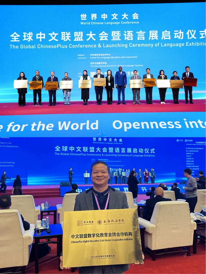 我校国际交流处处长、留学生工作办公室主任欧阳美和带队参加了世界中文大会,在中国教育国际交流展区设置我校展位,向来自全球的参会高校、机构、学生推介我校国际化教育项目。大会期间,我校作为中文联盟全球合作伙伴,获得中文联盟数字化教育“金牌合作机构”表彰,我校推荐的两位远程中文教育教师获得全国“金牌教师”称号。