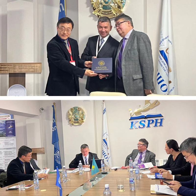 在哈萨克斯坦,刘志强一行首先在教育展上对参展学生开展招生宣传,对我校国际学生招生项目进行充分交流。其次,我校代表团与哈萨克斯坦国立大学校长占塞伊特·图伊梅巴耶夫及该校国际交流负责人进行了交流,刘志强介绍了我校办学情况,就交换生学分互认、教师互访等进行了深入交流,初步达成合作意向。最后,我校代表团访问了哈萨克斯坦公共医科大学,在与副校长Jumabekov Aueskhan Tulegenovich交流中,刘志强表示在公共卫生法律政策等研究领域以及人才培养方面有较大合作空间,对方对我校相关专业也表达了浓厚兴趣,期待在科学研究、师生互访互换交流等人才培养项目中展开合作。