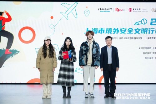 近日,由上海市人民政府外事办公室、上海市教育委员会、上海市文化和旅游局指导,上海市人民广播电台主办的“中国银行杯”上海市境外安全文明行校园大赛在上海广播艺术中心举行决赛。大赛吸引了来自全市近二十所高校的千余名大学生参加,我校经济管理学院王莉娅同学、国际法学院史美蝶同学、语言文化学院史崧宏同学通过校内选拔,作为我校代表队参加复赛,并顺利进入决赛。