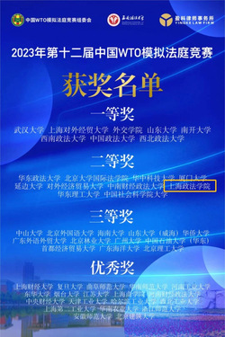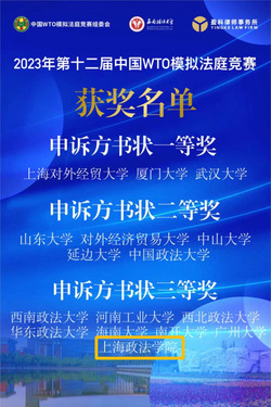2023年第十二届中国WTO模拟法庭比赛(China WTO Moot Court Competition,以下简称“WTO模拟法庭”)于12月17日圆满收官。经过激烈角逐,我校代表队在全国49个赛队中脱颖而出,荣获全国二等奖及申诉方书状三等奖!