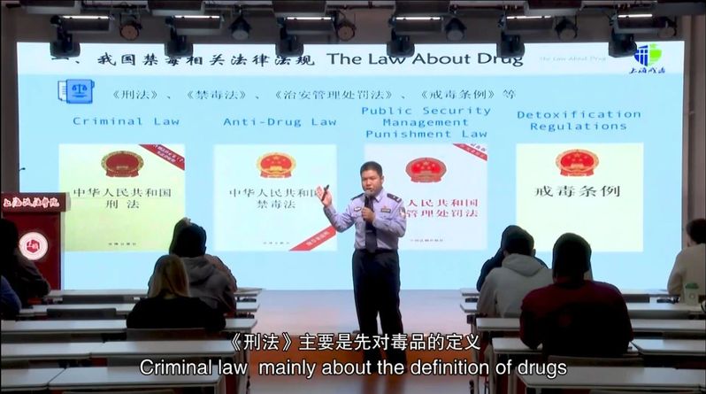 2023年9月,我校收到来自上海市高境强制隔离戒毒所教育科的授课合作邀请函,学生工作部留学生管理与服务中心积极配合组织筛选我校国际学生禁毒志愿者参加授课合作。在课程的设计上,上海市高境戒毒所民警沈煜黄引述联合国毒品问题报告、中国近代史等内容,向我校外籍留学生讲解我国禁毒法律法规形成背景及相关条文细则,通过讲解真实戒毒康复案例,说明吸毒危害后果,并介绍五项戒毒新技术,指导留学生体验太极康复操等科学康复手段,帮助外籍留学生提高毒品认知、增强拒毒意识、树立守法信念。