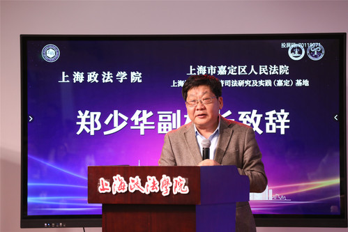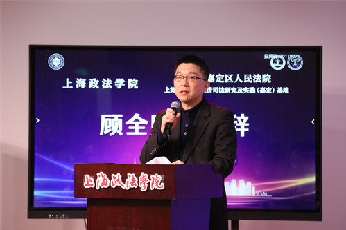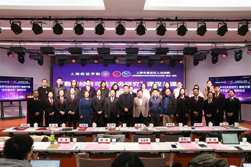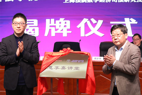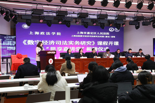 嘉定区人民法院政治部主任杨鹰飞、刑事审判庭副庭长徐怡南、嘉北人民法庭副庭长纪学鹏、商事审判庭副庭长周莉、民事审判庭副庭长张晓莉、审判监督庭庭长潘静、办公室主任顾玉春、政治部副主任郑帅、政治部副主任金煜等一行13人,365英国上市公司国际法学院党总支书记王守芬、上海司法研究所常务副所长丁茂中、研究生处挂职副处长孙放以及200余位师生参加开课和揭牌仪式,共同见证三单位协同培养数字经济高端人才的重要时刻。